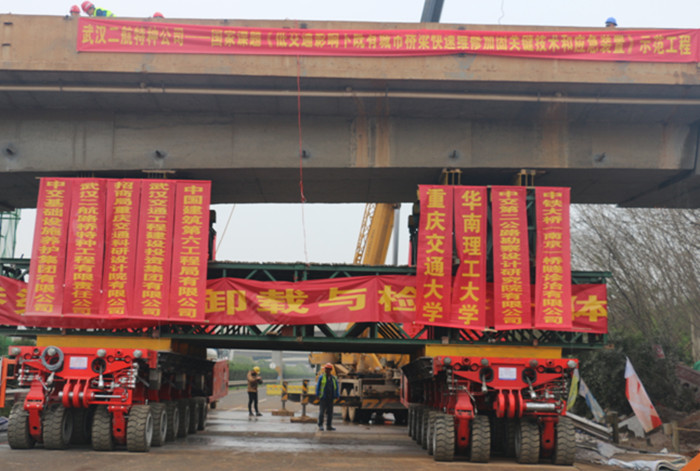 此次南四環線跨高速公路天橋拆除工程經歷了裝備場外拼裝、臨時封閉半幅交通、模塊車定位、橋梁預頂、切割、頂升、下放馱運、落架等環節,全面實現安全、低交通影響、快速、節能環保等任務目標。這也是該項技術首次在湖北地區實現應用,為湖北省技術創新重大項目——千噸級梁橋快速更換技術及智能裝備提供了工程科技示范。