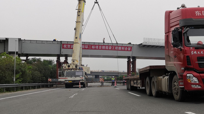北四環(huán)線主線及白沙灣互通A、B匝道上跨武英高速公路設(shè)計為鋼箱梁結(jié)構(gòu),主線橋孔跨為(35+60+35)m,匝道橋孔跨為(35+50+35)m,鋼材總量約5690t。鋼箱梁上跨武英高速公路施工,是北四環(huán)項目的控制節(jié)點之一。為此北四環(huán)公司高度重視、精心組織、超前部署,多次組織相關(guān)生產(chǎn)專題會,確保質(zhì)量合格,安全零事故。