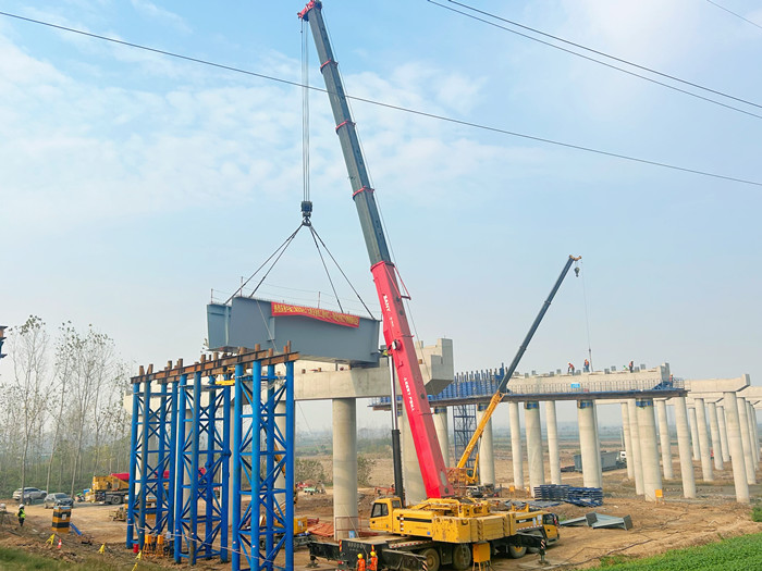 跨四邑公堤大橋是漢南長江大橋及接線工程的關鍵性控制工程,全長70米,鋼箱梁共計架設32節,本次吊裝的首節鋼箱梁長13.7米,重28.9噸,使用1臺350噸汽車吊起吊安裝。面對施工作業面有限、吊裝跨徑大、運輸距離遠等不利因素,漢南橋公司多次梳理安全風險點,督促參建單位對施工人員進行安全、技術、質量交底,全程盯控鋼箱梁制作、運輸、拼裝、吊裝等各個環節。在鋼箱梁焊接拼裝過程中,合理選擇焊接材料,嚴控焊接質量和拼縫寬度,保障梁體的焊接強度和支撐穩定。