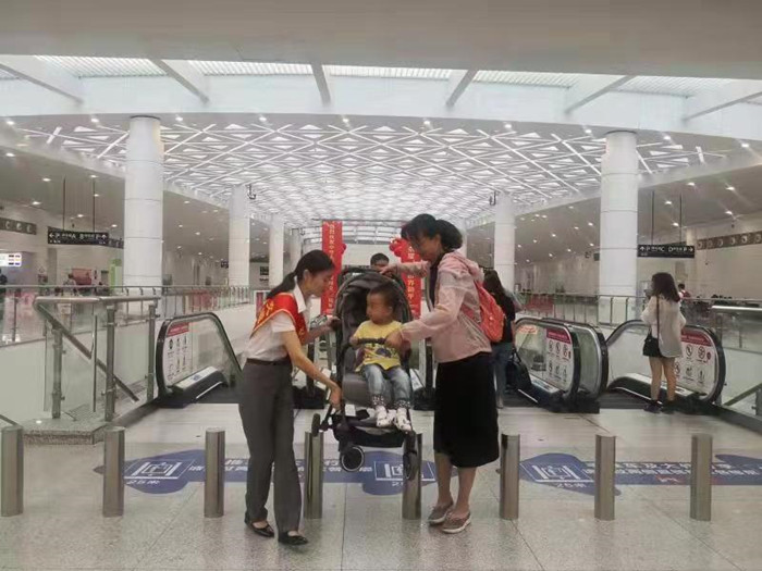 武漢交投集團(tuán)天河機(jī)場交通中心青年志愿者為旅客提供志愿服務(wù)
