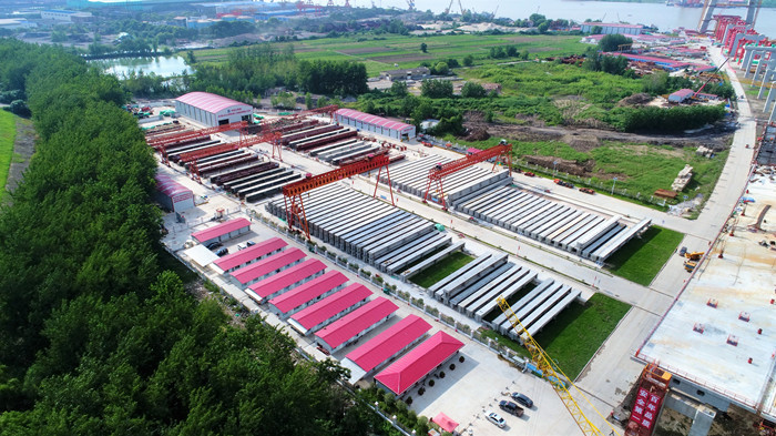 2018年7月,中國施工企業管理協會在青山橋南岸預制梁場舉辦“綠色建造、綠色發展”觀摩交流會,全國 200 余名綠色環保工程專家齊聚現場。53畝的標準化T梁預制場布置有制梁區、存梁區、封閉式鋼筋加工車間、辦公及生活區四大核心區,大面積草坪和植被環繞,整潔美觀、自然和諧。梁場進出口設置的車輛自動沖洗裝置,有效抑制施工現場揚塵。水泥、粉煤灰等粉粒性原材料全部使用專用車輛運輸;各類臨時設施均采用標準化、可拆遷、可回收材料,減少資源浪費。基坑開挖采用鋼板樁圍堰,減少土方開挖和回填量,保護用地。大體積混凝土采用冷卻水管循環水,預制 T 梁全自動循環水噴養護;梁場隨處可見的太陽能路燈、空氣能熱水器等清潔能源;用多層鋼骨架活動板房建設的臨時辦公和生活用房,處處踐行節能環保。