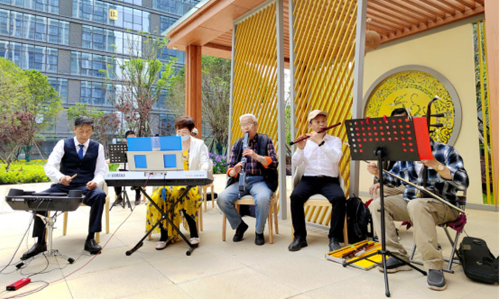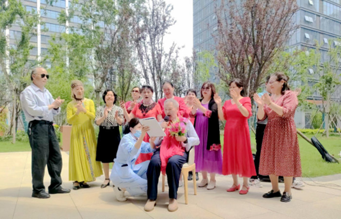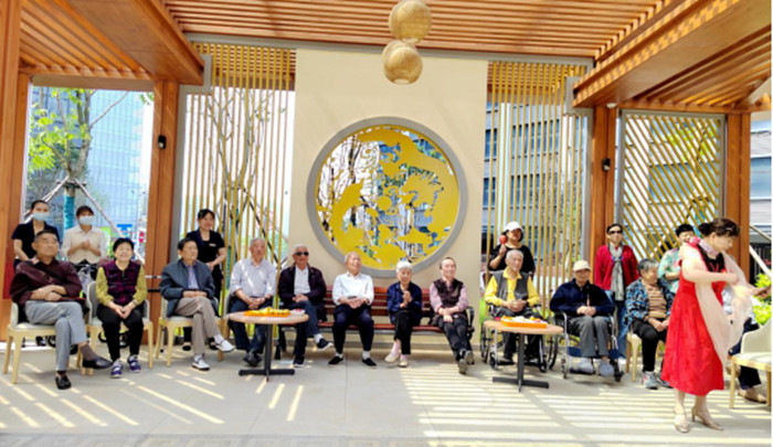 上午10點,康養園區小廣場上笑聲不斷,吹拉彈唱設備架起來,演員們換上舞蹈服,主持人開始報幕,入住老人被護理人員有秩序地攙扶下樓,一邊觀看節目,一邊曬著太陽,享受著園區內獨有的春色。
