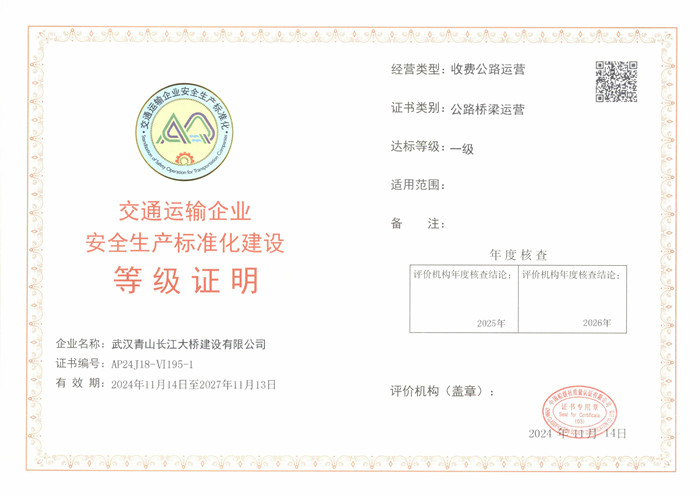 近日,交投集團青山長江大橋公司、高速公路運營公司雙雙通過交通運輸企業安全生產標準化達標認證考核,喜獲“交通運輸企業安全生產標準化建設等級一級證書”,標志著集團安全生產管理“標準化、規范化、精細化”管理邁上新臺階。