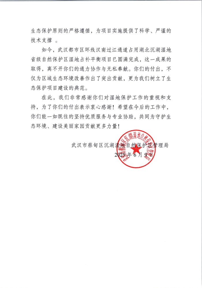 初夏六月,荷尖初露,武漢都市圈環線高速公路漢南長江大橋及接線工程沉湖濕地保護區內蛙鳴漸起、蒲草搖曳,處處涌動著蓬勃生長的活力。在這萬物競發的美好時節,項目團隊收到了來自蔡甸區沉湖濕地自然保護區管理局的感謝信。信中特別指出,項目團隊以科學的生態修復方案和高效的執行能力,在重大交通基礎設施建設與濕地生態保護間找到了平衡點,繪就了建設發展與生態保護同頻共振的和諧圖景,為同類項目樹立了標桿。這也標志著該項目濕地“占補平衡”工作圓滿收官,在兼顧生態效益與工程可行性具體實踐路徑上又探索出了新路徑。